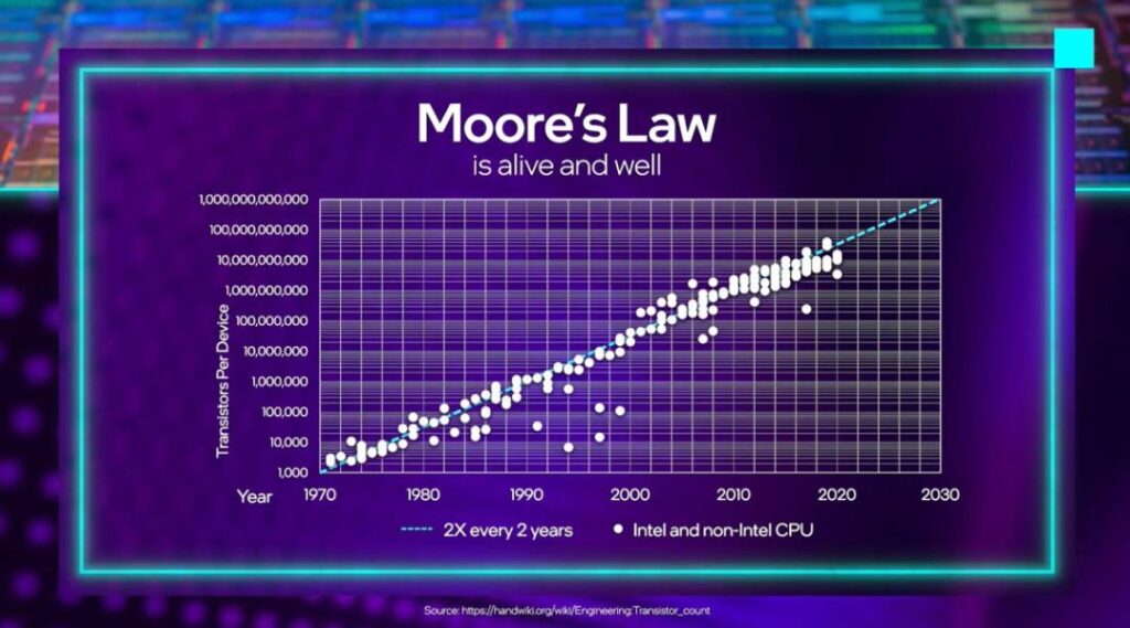 Le matériel double de puissance tous les 2 ans. Ce doublement régulier a permis une croissance spectaculaire de la performance informatique pendant plusieurs décennies. Depuis quelques années maintenant, la loi de Moore ralentit, car on approche des limites de miniaturisation des transistors (effets quantiques, chaleur, coûts très élevés).
